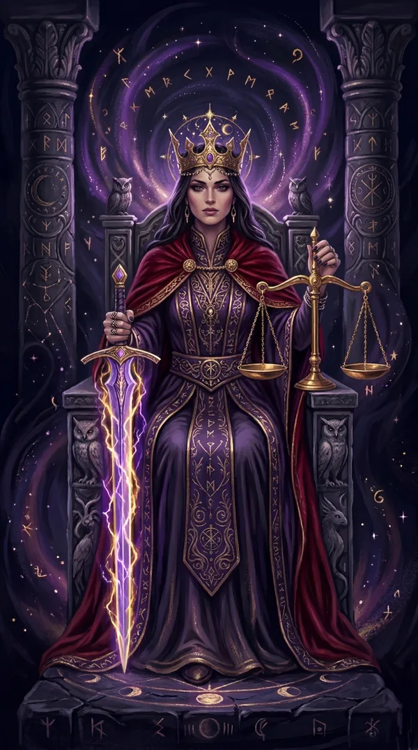 A crowned figure sits between pillars with a sword held upright and scales balanced in the other hand. A red cloak falls over a stone seat.