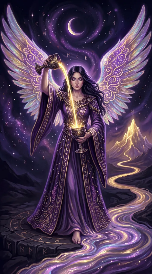 An angel pours water between two cups with one foot on land and one in a pool. A path leads to a glowing crown between distant mountains.