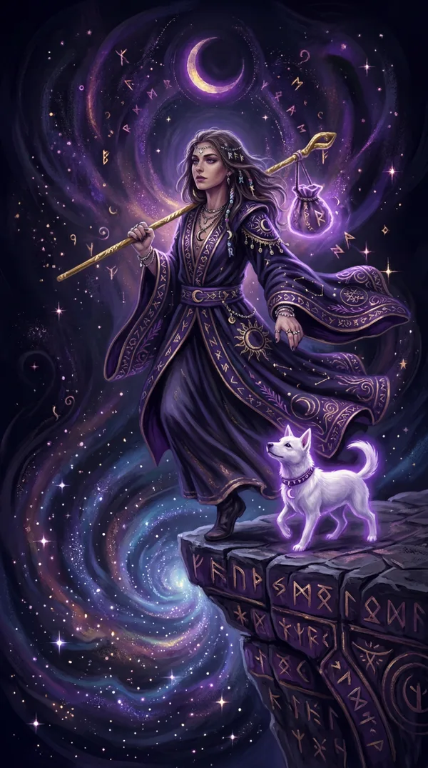 The same cliff edge feels closer. The traveler's gaze drifts down. The dog warns as the next step turns uncertain.