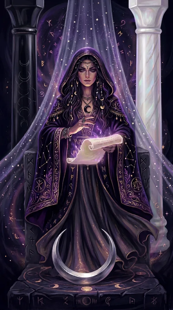 A veiled priestess sits between black and white pillars. The moon crowns her head and a scroll rests in her lap behind a curtain of pomegranates.