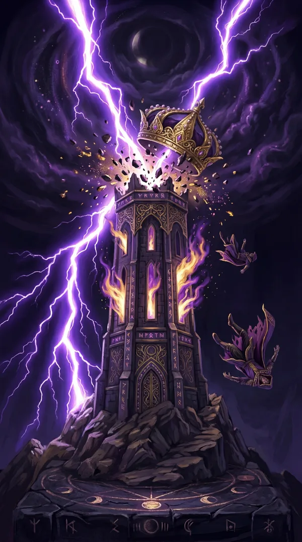 Lightning strikes a stone tower. Two figures fall through the dark. The crown at the top bursts into the sky.