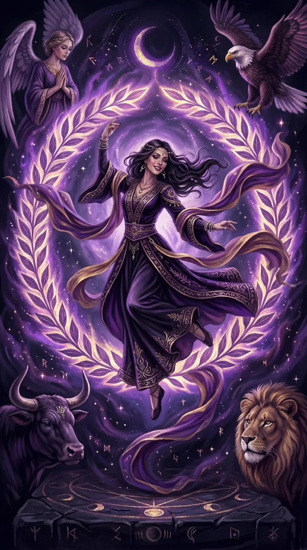 A dancing figure floats inside a green wreath holding two wands. The bull, lion, eagle, and angel watch from the four corners.